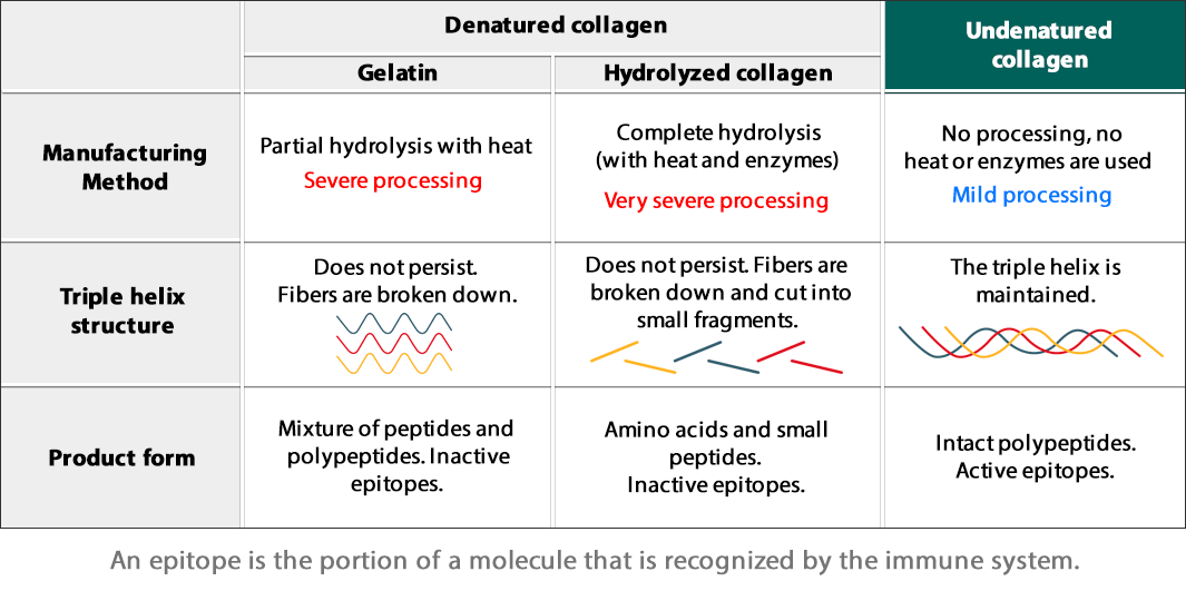 UC-II® is a non-denatured collagen. Unlike hydrolyzed collagens, UC-II® has a different and unique mechanism of action. It acts through a process called oral tolerance in which the immune system participates and makes it possible to achieve the desired results with a small dose of only 40 mg/day.