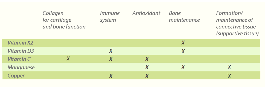 A set of nutrients designed to help keep bones in good condition 1, 2 and for the formation and maintenance of connective tissue (supporting tissue) 3, 4 and collagen 1.