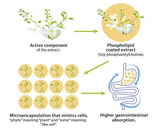 The Fitosoma® technology follows a patented method by which the individual components of a plant extract are coated with a phospholipid (phosphatidylcholine or phosphatidylserine). The human body recognizes these phospholipids as nutrients and allows the active ingredients of plants to naturally cross cell membranes, optimizing their absorption.