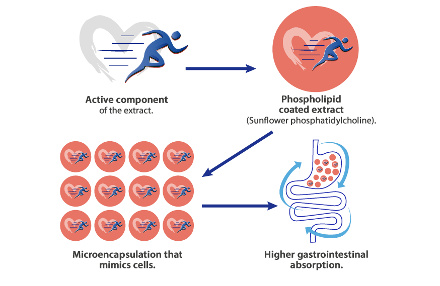 Fitosoma® technology follows a patented method by which a compound is coated with a phospholipid (phosphatidylcholine or phosphatidylserine). The human body recognizes these phospholipids as nutrients and allows the compounds to naturally cross cell membranes, optimizing their absorption.