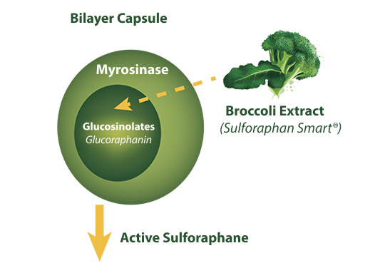 The ingredient containing activated NutriSGS®, Sulforaphan Smart®, is formulated in a bilayer structure, with the glucosinolate-rich extract, mainly glucoraphanin, in the core and the myrosinase extract (MYR) in the outer layer. The established encapsulation conditions allow the capsule to reach the intestine practically intact and to disintegrate once there. The dual core maximizes the bond between enzyme and reagent (GRP) because it keeps both components close together, reducing their diffusion through the intestine and therefore increasing the transformation ratio in the intestine, where absorption occurs.