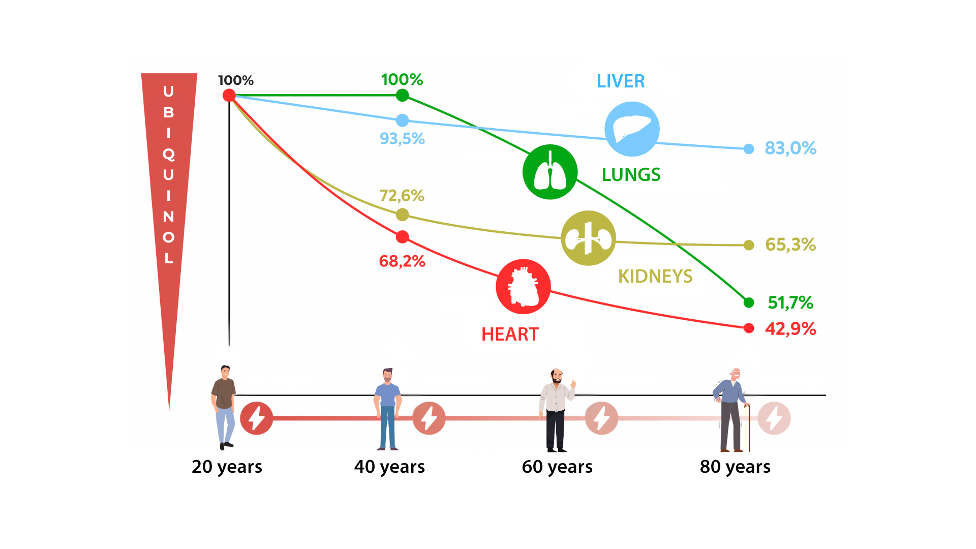 For example, at age 40, the amount of Ubiquinol in the heart muscle is 30% lower than at age 20.